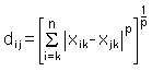 Distance and Similarity MeasuresDistances between objects in multidimensional space form the basis for many multivariate methods of data analysis. Using a different method for calculating the distances may influence the results of a method considerably. Similarity of objects and distances between them are closely related and are often confused. While the term distance is used more precisely in a mathematical sense, the particular meaning of the term similarity often depends on the circumstances and its field of application. In general, the distance dij between any two points in n-dimensional space may be calculated by the equation given by Minkowski: ![]() with k being the index of the coordinates, and p determining the type of distance. There are three special cases of the Minkowski distance: