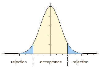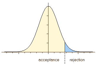 One-Sided vs. Two-Sided TestsSince making a decision is - statistically speaking - the selection of a threshold value on a one-dimensional scale (i.e. on the argument axis of the probability density plot), we have to distinguish between two cases: first, one may ask whether a property lies above or below a pre-defined threshold (left figure, below). In this case we have to apply a one-sided test. Secondly, one may be interested to determine whether a property is within certain boundaries. This question involves setting two boundaries and asks for the probability of an event lying either between or outside these boundaries (right figure). In this case we have to apply a two-sided test.