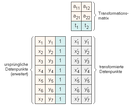 Die Matrizenmultiplikation ist ein vielseitiges Werkzeug für viele wissenschaftliche oder technische Methoden. Eine spezielle Anwendung der Matrizenmultiplikation ist die Transformation von Daten im n-dimensionalen Raum. Die Daten können durch eine simple Matrizenmultiplikation skaliert, verschoben, rotiert oder verdreht werden. Um alle diese Operationen durch eine einzige Matrixtransformation auszuführen, muss die Originaldatenmatrix durch einen zusätzlichen konstanten Wert (vorzugsweise 1) erweitert werden. Die Effekte der Matrizenmultiplikation können Sie durch das folgende interaktive Beispiel sehen. Beispiel: Transformation von zweidimensionalen Punkten. Nehmen wir an, wir hätten 7 Datenpunkte in 2 Dimensionen (x und y). Diese 7 Datenpunkte müssen verschiedensten Transformationsoperationen unterzogen werden. Dafür erweitern wir die Datenmatrix, geschrieben als [xi,yi], mit einem konstanten Wert von 1, was in den Punktvektoren [xi,yi,1] resultiert. Um die verschiedenen Transformationen auszuführen, müssen wir einfach die