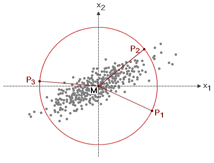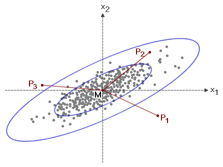 Die Wahrscheinlichkeit, dass an der Stelle P1 ein Datenpunkt auftritt, liegt bei 0.1%, an der Stelle P2 liegt sie in diesem Beispiel bei ca. 4%. Man kann nun Kurven gleicher Wahrscheinlichkeit einzeichnen (Ellipsen), so dass Punkte entlang einer solchen Ellipse die selbe Auftrittswahrscheinlichkeit aufweisen. Oder anders formuliert: In "multivariaten Standardabweichung" gemessen, haben die Punkte auf der Ellipse alle den selben Abstand vom Mittelpunkt. Die Ellipsen konstanter Wahrscheinlichkeit entsprechen einer konstanten Mahalanobis-Distanz.