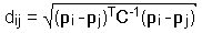 Die Mahalanobis-Distanz berücksichtig die unterschiedlichen Standardabweichungen entlang der Achsen des n-dimensionalen Raumes und auch die Korrelationen zwischen den einzelnen Achsen. Zur Berechnung der Mahalanobis-Distanz dij zwischen den Punkten Pi und Pj muss die Kovarianzmatrix des betreffenden Datenraumes bekannt sein: